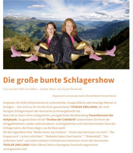 Eine tolle Show lieferten Annika Stöver und Annett Buchinski im Gästezentrum und verbreiteten mit ihrer Schlagershow viel gute Laune. Wer kennt sie nicht die Tessler Zwillinge, Sirene Gletscher, Marianne Hosenzwerg und viele mehr.