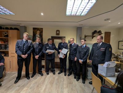 Es wurden wurden folgende Beförderungen aufgrund erfüllter Dienstzeiten und Lehrgänge ausgesprochen: Tom Boosch zum Feuerwehrmann, Patrick Zachow zum Oberfeuerwehrmann, Alexander Siewert und Tom Heimbüchel zum Hauptfeuerwehrmann.