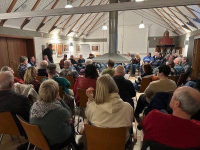Trotz des Schneewetters hatten sich im Saal des Gästezentrums mindestens 70 Personen rund um das Herdfeuer versammelt, um den interessanten Berichten der vier Kapitäne zu lauschen.