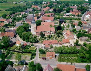 v.l.n.r.: Schule aus der Schwedenzeit 17. Jahrhundert, Kirche von ca 1200 und Alte Schule von 1850