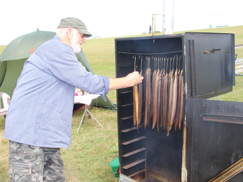 Die Aale haben vor dem Räuchern ein Salzbad genommen und kommen gleich in den Ofen